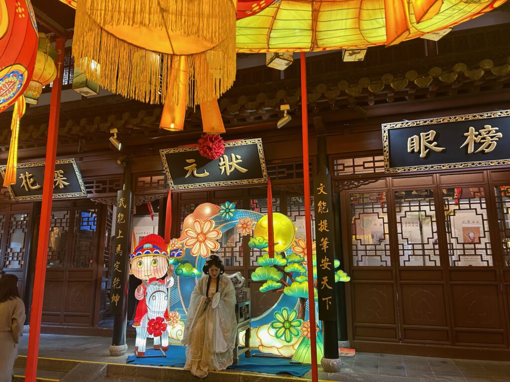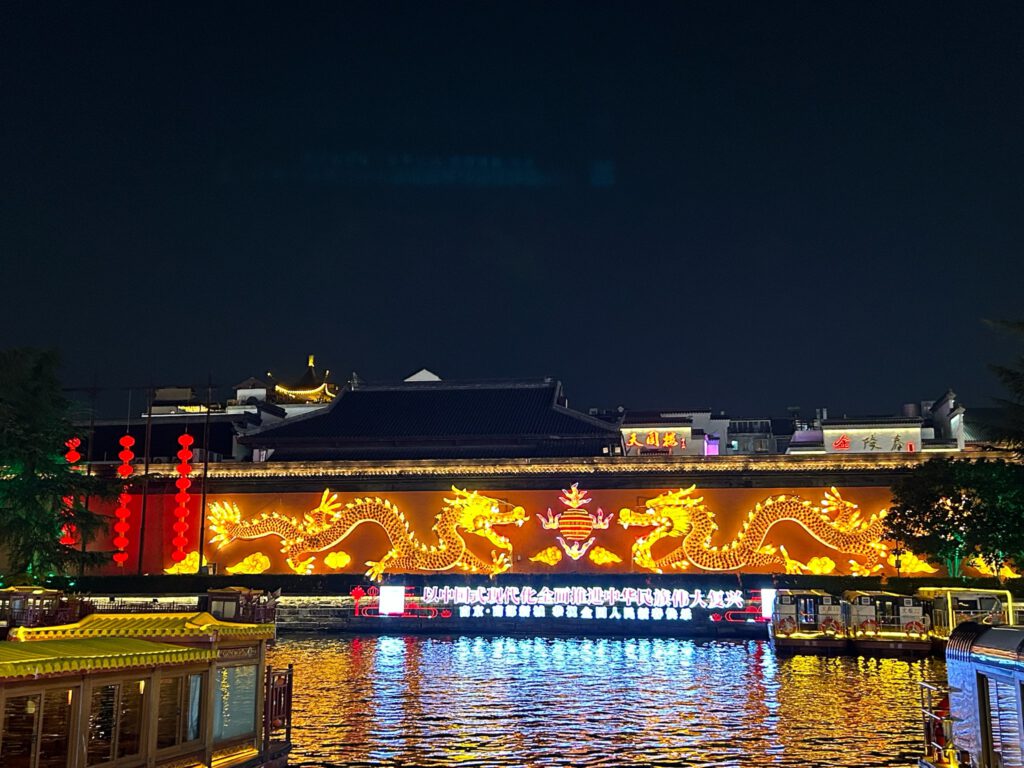 傍晚时分,秦淮河已华灯初上。秦淮河畔游人如织,河水潺潺,两岸灯火辉煌,映照着古老的夫子庙建筑群。夫子庙小吃街有着地道的金陵美食:鸭血粉丝汤、盐水鸭、牛肉锅贴……夜色中的秦淮河,既有江南水乡的温柔,又不失帝王之都的威仪。